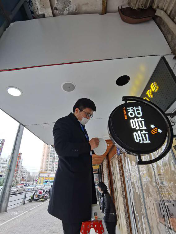 (市場(chǎng)部員工協(xié)助加盟商更換門(mén)頭燈)