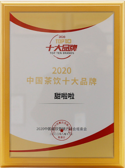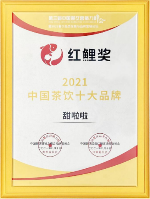 在2021年9月23日第三屆中國餐飲(品類)十大品牌頒獎盛典中,甜啦啦憑借自身強大的品牌實力,蟬聯(lián)中國茶飲十大品牌獎, 位居第九, 較之去年提升一位,。本次盛典是從品牌傳播指數(shù)、品牌影響力指數(shù)、企業(yè)經(jīng)營指數(shù)、品牌美譽度、品牌關注指數(shù)五大維度,結合線上投票加線下綜合評審雙渠道的評分法,進行綜合評估,在數(shù)百個茶飲品牌中評選出茶飲品類的優(yōu)秀品牌。這是對甜啦啦品牌更進一步的肯定,也是甜啦啦品牌對自己,交出的滿意答卷。