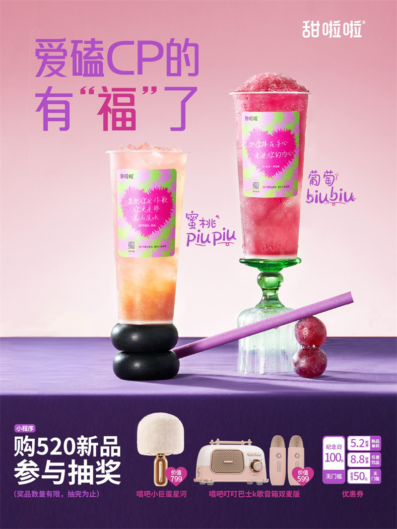 在5月浪漫經(jīng)濟(jì)的推動(dòng)下,新茶飲品牌甜啦啦上新的520CP產(chǎn)品銷量躋身top10,其中“葡萄biubiu”上新期間銷量位列第三。甜啦啦以鮮果茶為載體,發(fā)出5月系列浪漫營(yíng)銷,向用戶傳遞“萬(wàn)物小得盈滿,甜蜜恰逢其時(shí)”的美好祝愿。